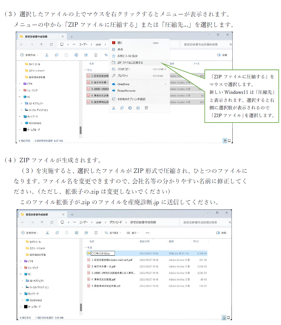 ファイルを圧縮してひとつにまとめる方法は以下の通りです。